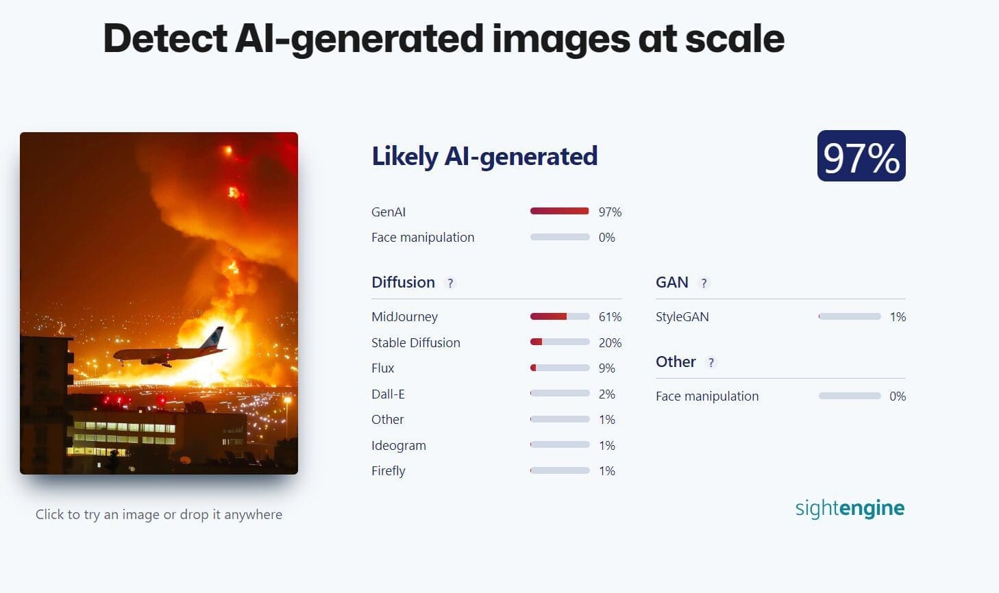 علاوة على ذلك؛ وبفحص الصورة بإحدى التقنيات المستخدمة للكشف عن الصور المولدة بالذكاء الاصطناعي، أظهرت النتائج أن الصورة من المحتمل أنه تم إنشاؤها بواسطة الذكاء الاصطناعي بنسبة 97%، ومولدة باستخدام MidJourney.