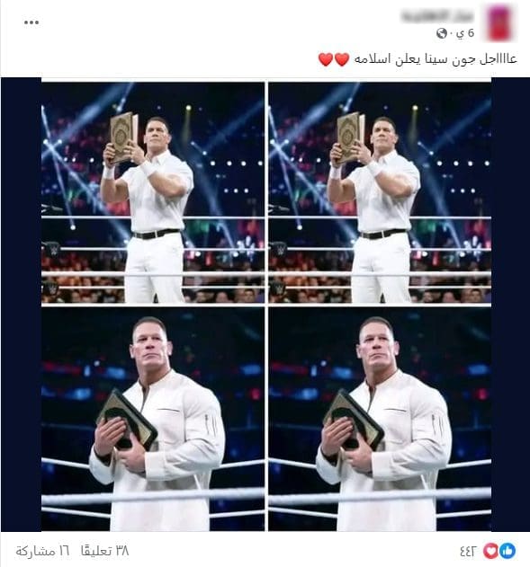 هذه الصور مولدة باستخدام برامج الذكاء الاصطناعي، ولا تُظهر المصارع جون سينا معلنًا اعتناقه الإسلام على حلبة المصارعة