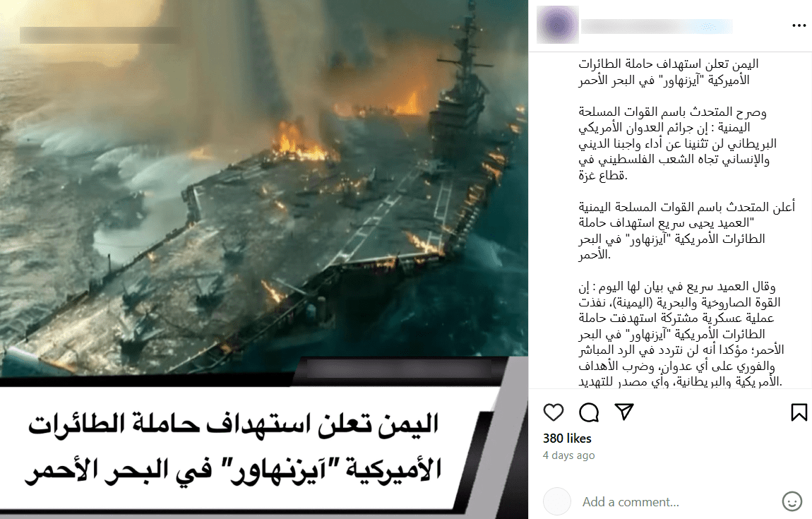 صورة غير حقيقية يتم تداولها على أنها لاستهداف حاملة الطائرات “إيزنهاور”