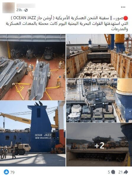 صور… || سفينة الشحن العسكرية الأمريكية ( أوشن جاز OCEAN JAZZ ) التي استهدفتها القوات البحرية اليمنية اليوم كانت محملة بالمعدات العسكرية والمدرعات