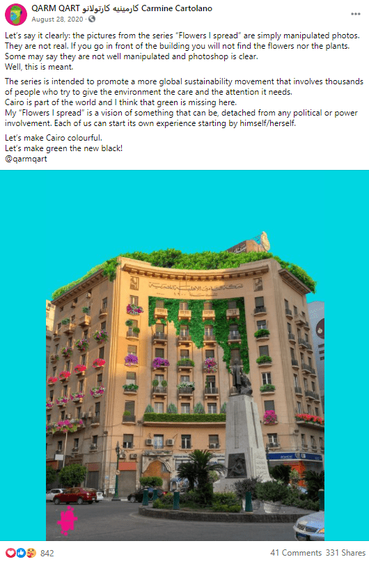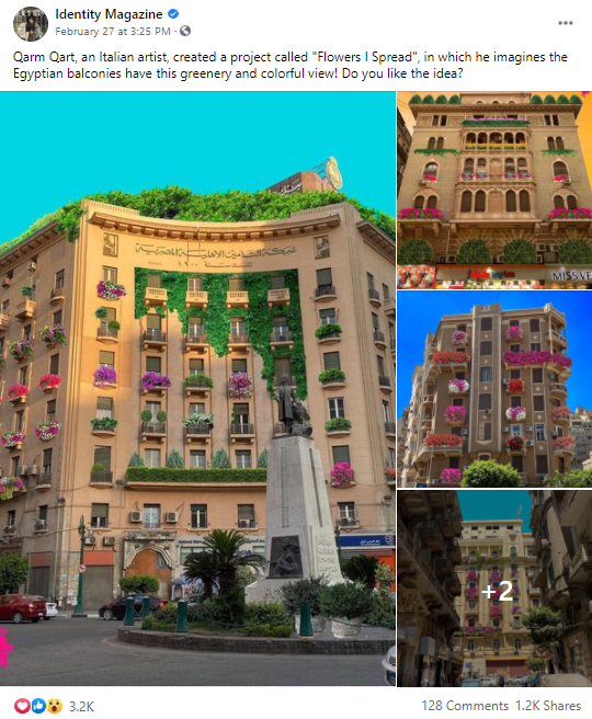 الفنان الإيطالي ” Qarm Qart ” ابتكر مشروعًا بعنوان “أنا أنشر الزهور”، حيث يتخيل أن الشرفات المصرية تتمتع بهذه المساحات الخضراء والمنظر الملون!،