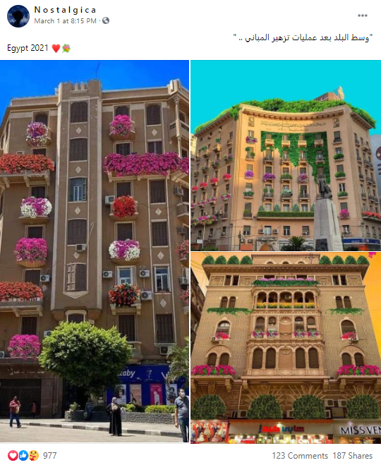 انتشرت على مواقع التواصل الاجتماعي فيسبوك وتويتر صور تظهر مباني مزينة بالزهور ، وادعى ناشرو الصور بأنها عملية تزهير مباني في وسط البلد في مصر .