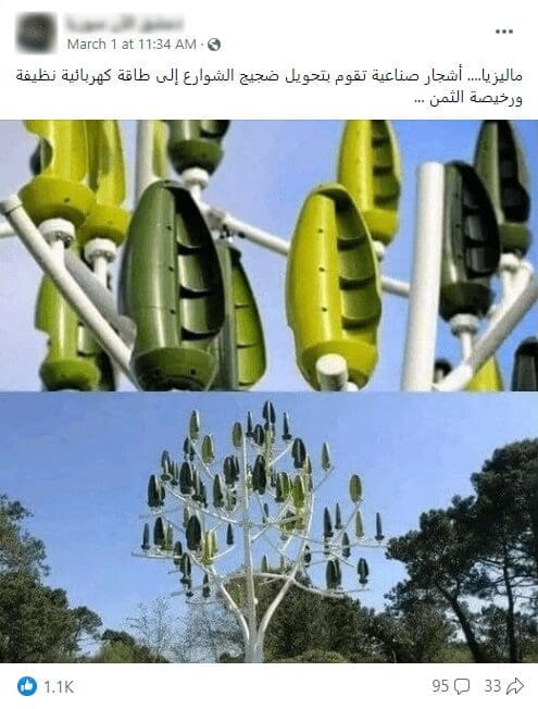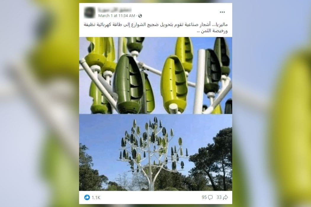 تناقل بعض الناشطين على منصة فيسبوك صورة يدّعي ناشروها أنها تُظهر أشجارًا صناعيةً تحوّل ضجيج الشوارع في ماليزيا إلى طاقة كهربائية،