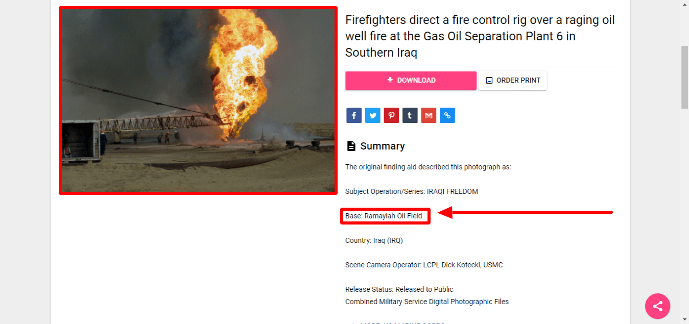 وفي وصف الصورة كٌتب بأنها تعود لفريق اطفاء كويتي اثناء محاولة اخماد حريق في حقل الرميلة عام 2003.