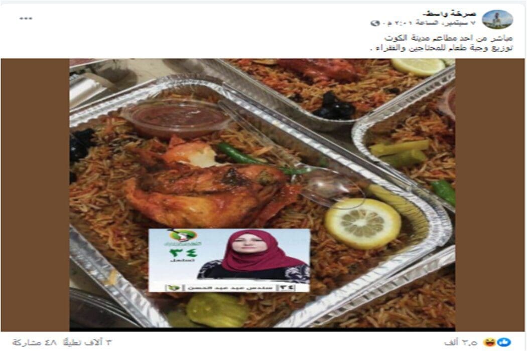 يتداول روّاد مواقع التواصل الاجتماعي صورة يزعم أنها وجبات طعام مجانية مقدمة للفقراء والمحتاجين في مدينة الكوت، من قبل مرشحة الانتخابات التشريعية العراقية سوسن عبد الحسن اللامي،