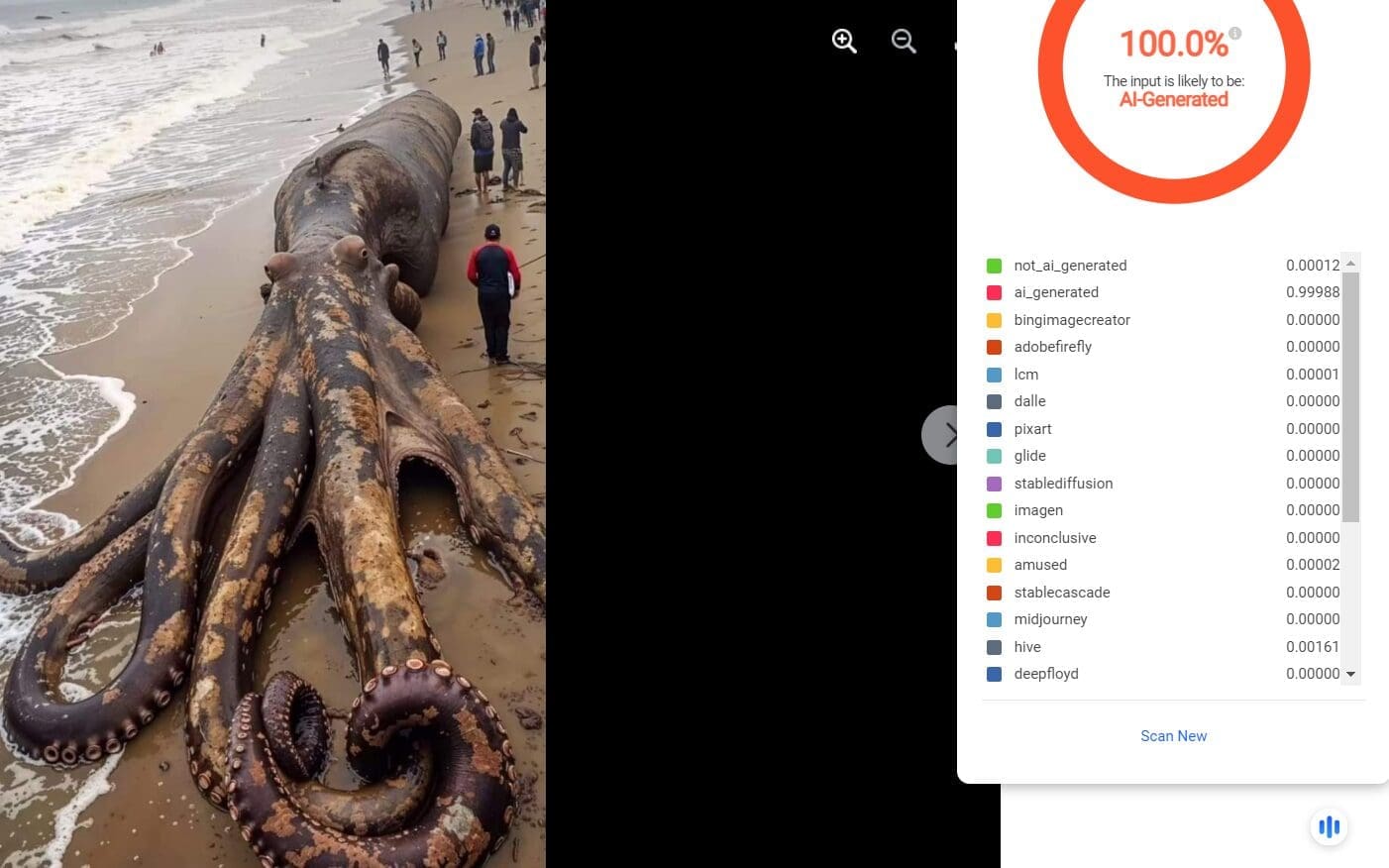 إلى ذلك؛ كشفت أداة Hive AI detector المخصصة لفحص الصور المولدة بواسطة الذكاء الاصطناعي أن الصورة قد تكون مولدة بواسطة الذكاء الاصطناعي بنسبة %100