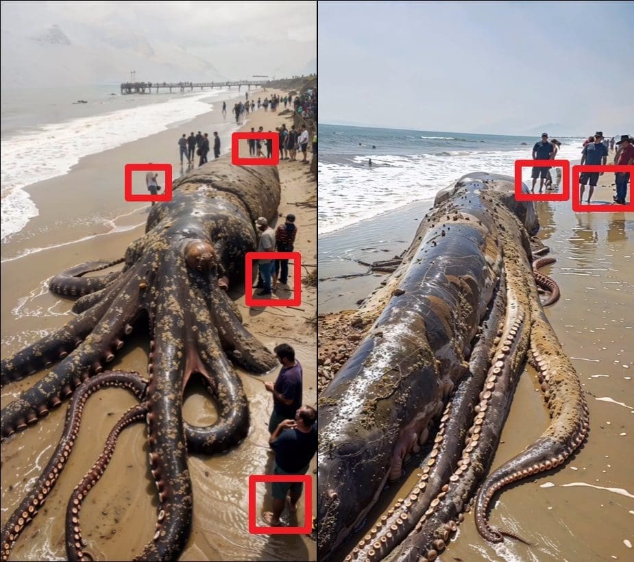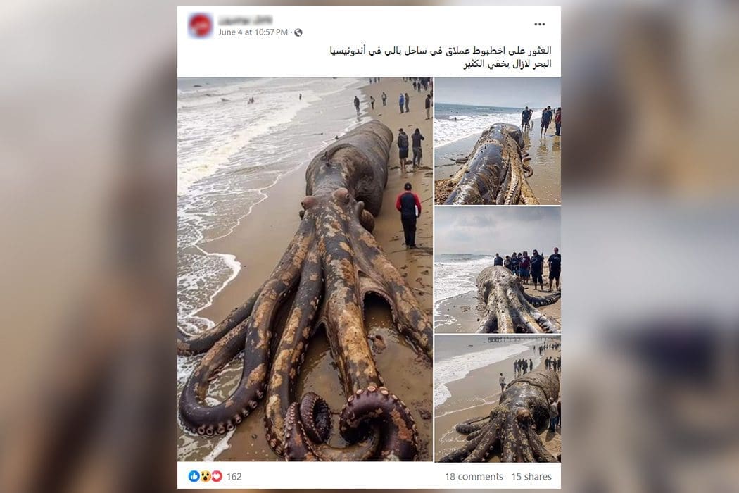 هذه الصور مولدة بواسطة الذكاء الاصطناعي، ولا تبين أخطبوطًا عملاقًا عثر عليه في ساحل بالي في أندونيسيا