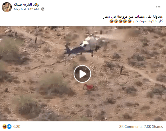 انتشر على مواقع التواصل الاجتماعي فيسبوك وتويتر مقطع فيديو يزعم ناشروه أنه يظهر عملية انقاذ بالمروحية لمصاب في مصر،