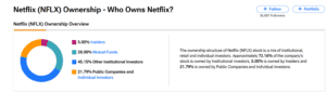 وبحسب موقع شركة TipRanks فإن ملكية أسهم Netflix (NFLX) عبارة عن مزيج من المستثمرين من المؤسسات والأفراد، حوالي 73.16% من أسهم الشركة مملوكة لمستثمرين مؤسسيين، و5.05% مملوكة لمطلعين و21.79% مملوكة لشركات عامة ومستثمرين أفراد.