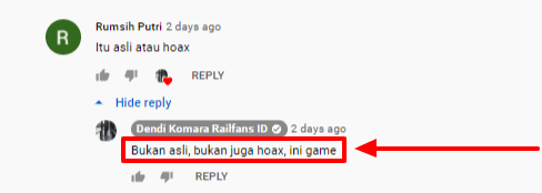 وكانت قناة Dendi Komara Railfans ID قد نشرت مشاهد من مقطع الادعاء بتاريخ 2020/08/10 وقالت القناة في وصف المقطع بأنه من لعبة محاكاة القطار، وبحسب حساب تويتر الخاص في قناة اليوتيوب فأن صاحب القناة مقره في إندونيسيا