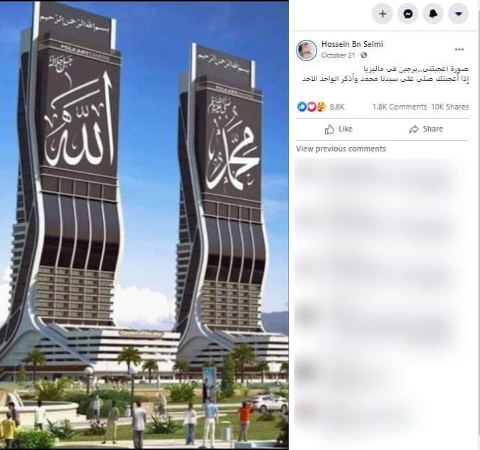 انتشر على مواقع التواصل الاجتماعي فيسبوك صورة تٌظهر برجين كتب عليهم (محمد ﷺ) ولفظ الجلالة (الله عزّ وجلّ) وادعى ناشرو الصورة بأنها تعود لبرجين في ماليزيا وتعود الصورة الاصلية لبرج فولكارت في تركيا وليس لها علاقة في ماليزيا