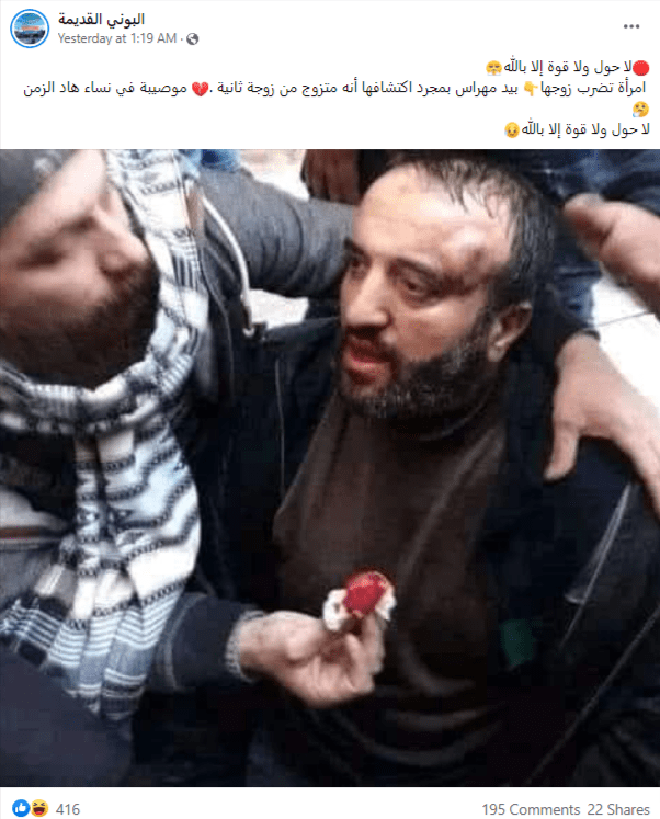 انتشرت على مواقع التواصل الاجتماعي صورة يزعم ناشروها أنها تعود لرجل ضربته زوجته على رأسه بسبب زواجه الثاني، فما حقيقة هذه الصورة؟