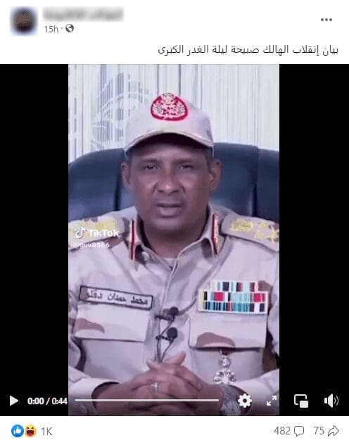 تناقل بعض الناشطين على الفيسبوك مقطع فيديو يدّعي ناشروه أنه يظهر حميدتي يتلو بيانَ الانقلاب المسجل صبيحة يوم 14 أبريل.