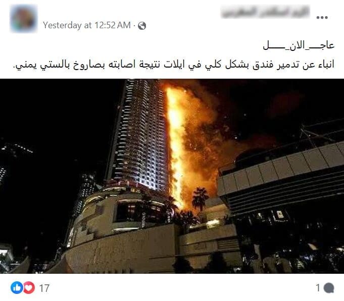 هذه الصورة تظهر اشتعال فندق العنوان في دبي عام 2015، وليست لاشتعال فندق في إيلات نتيجة القصف الحوثي مؤخرًا