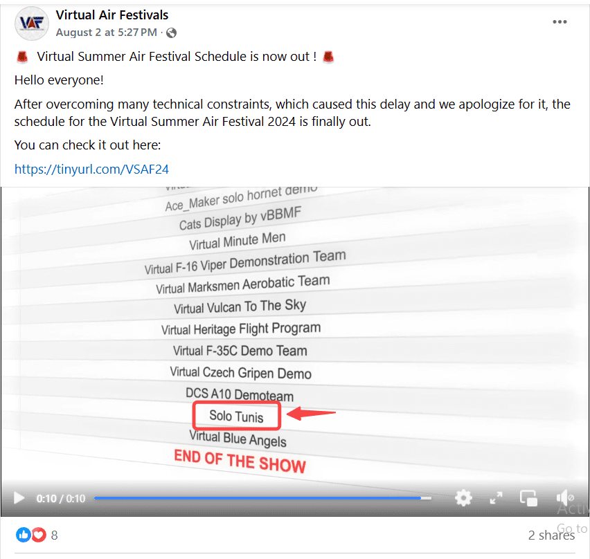 قاد البحث العكسي عن إحدى لقطات المقطع على Google Lens إلى منصة يوتيوب، حيث نشرت إحدى قنوات المنصة “Solo Tunis” المقطع في 2 أغسطس 2024، مبيّنة أن هذه المشاهد هي مقطع دعائي لإعلان ناشر المقطع مشاركته في مهرجان الطيران الصيفي الافتراضي 2024.