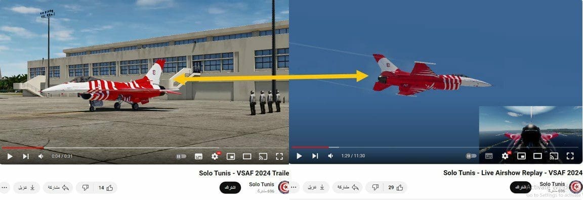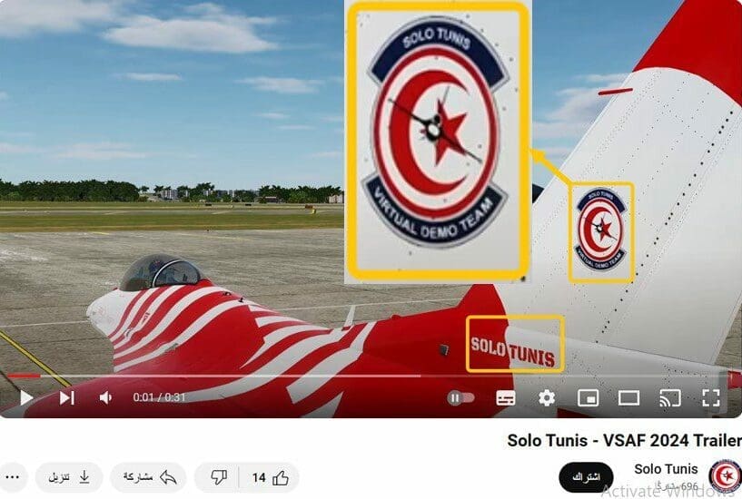 هذا وتعرض الصورة التالية لقطة شاشة من المقطع، حيث يظهر على الطائرة اسم القناة الناشرة “Solo Tunis”، وعبارة “الفريق التجريبي الافتراضي”.