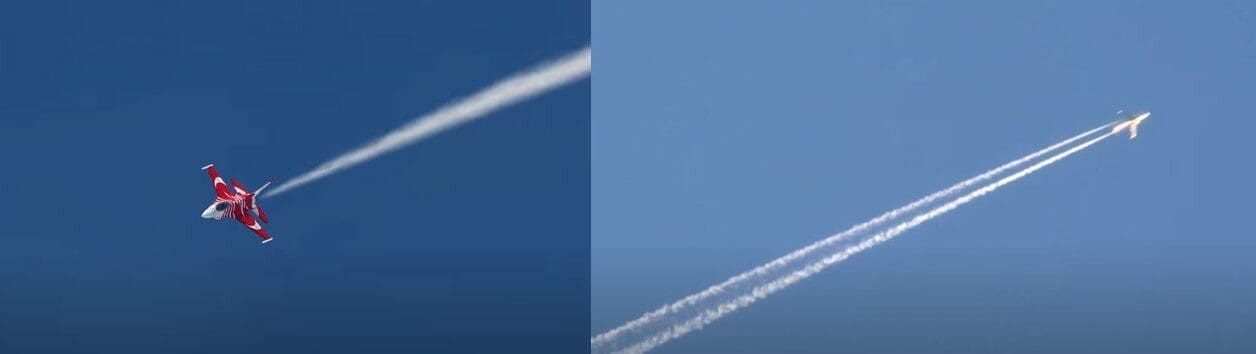 وتظهر الصورة الآتية مقارنة بين المسار الخارج في الحقيقة من إحدى الطائرات (يمين)، مع لقطة من مقطع الادعاء (يسار).