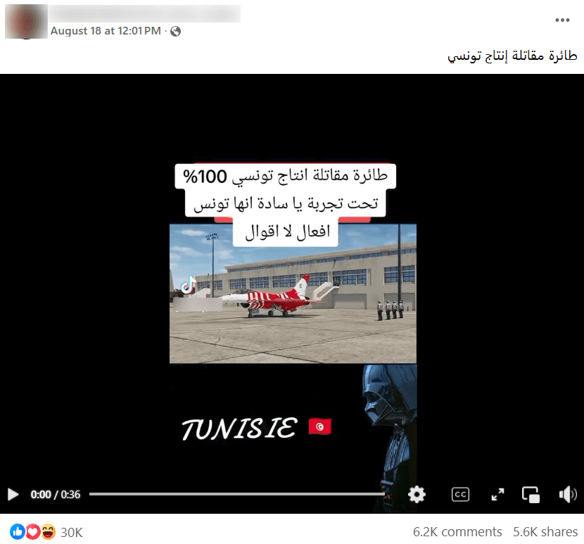 هذا المقطع غير حقيقي وليس لطائرة مقاتلة تونسية، بل يظهر طائرة من نظام محاكاة رقمي شاركت في مهرجان طيران افتراضي