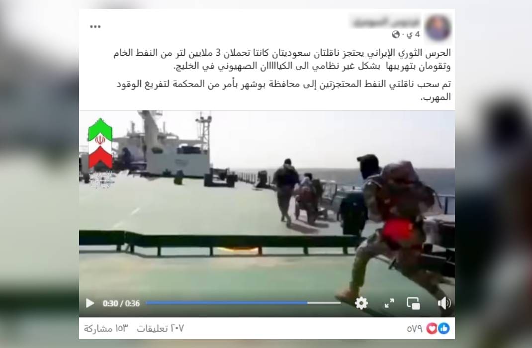 هذا المقطع يعود إلى احتجاز القوات الإيرانية لناقلة النفط اليونانية برودنت واريور عام 2022، ولا يصور احتجاز الحرس الثوري الإيراني لناقلتي نفط سعوديتين مؤخرًا
