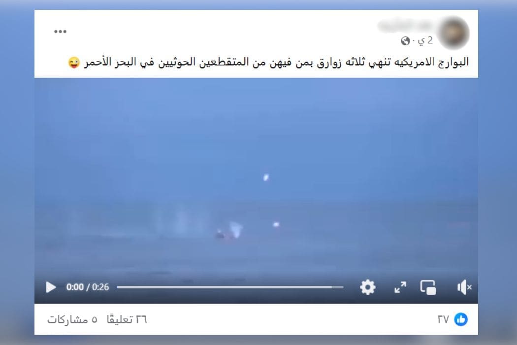 نقلًا عن وكالة رويترز -دون تصرف-: “صدت المروحيات الأمريكية هجومًا شنه مسلحون حوثيون المدعومين من إيران على سفينة حاويات تابعة لشركة ميرسك في البحر الأحمر، مما أدى إلى إغراق ثلاث سفن ومقتل 10 مسلحين، وفقاً لروايات مسؤولين أمريكيين وميرسك وحوثيين يوم الأحد.” إثر ذلك، تناقل ناشطون على فيسبوك مقطعًا يدّعون أنه يصور لحظات استهداف القوات الأمريكية زوارق الحوثيين في البحر الأحمر،
