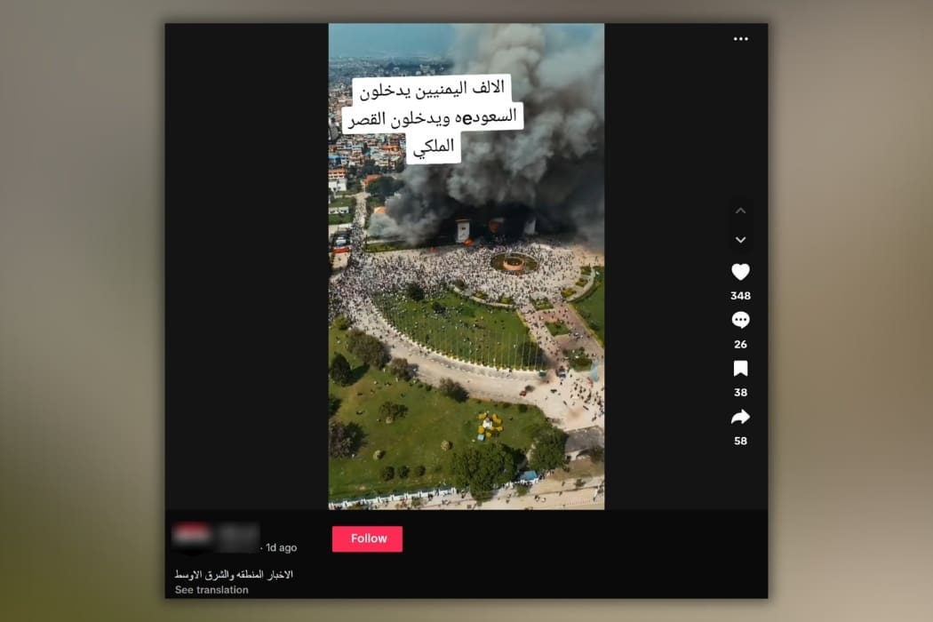 هذا المقطع لا يصور اقتحام يمني للقصر الملكي السعودي، بل يعود لقيام المتظاهرين في نيبال بحرق مبنى البرلمان النيبالي في سبتمبر 2025