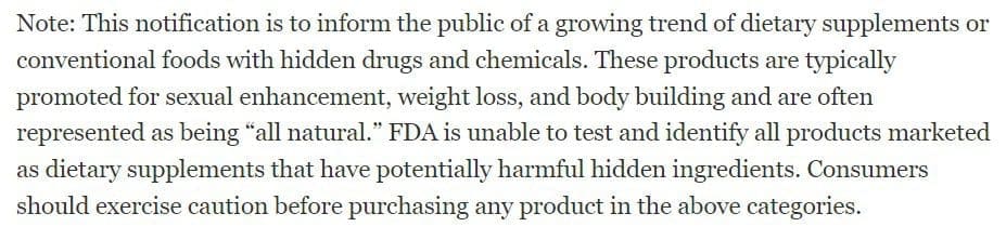 هذا وتنوّه FDA من إخطارها للجمهور بشأن هذه المنتجات لإعلامهم بالاتجاه المتزايد للمكملات الغذائية أو الأطعمة التقليدية التي تحتوي على أدوية ومواد كيميائية مخفية، التي عادةً ما يتم الترويج لهذه المنتجات لأغراض عدة من بينها، فقدان الوزن، وغالبًا ما يتم تقديمها على أنها “طبيعية بالكامل”
