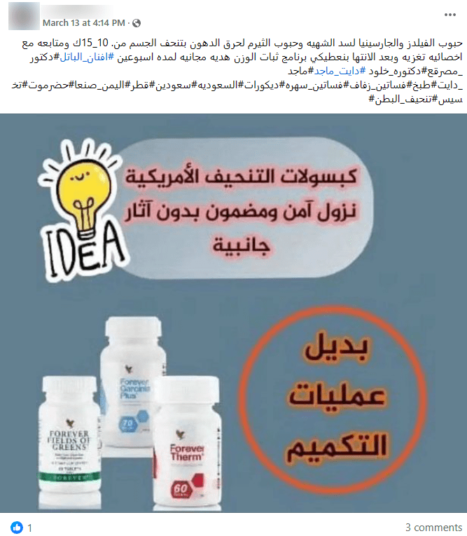 كما أضافت أن الحملة تضمنت المكملات الغذائية للعلامة التجارية “فوريفر” التي حذرت منها الهيئة عبر منصاتها الالكترونية، نذكر منها ما ورد في الادعاء: