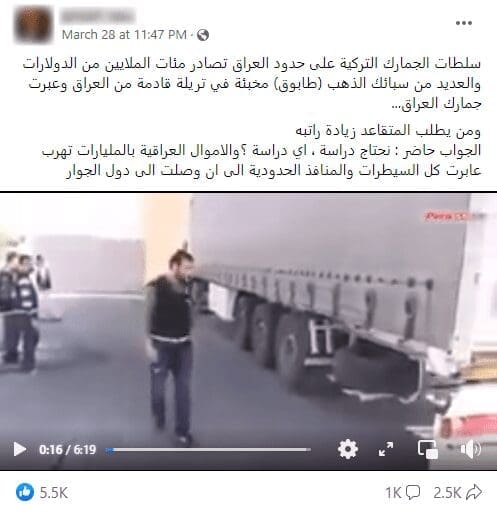 تناقل بعض الناشطين على منصة الفيسبوك مقطع فيديو يدّعي ناشروه أنه يظهر قيام جمارك تركيا بمصادرة أموال وسبائك ذهب مهربة قادمة من العراق.