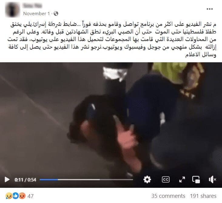 م نشر الفيديو على اكثر من برنامج تواصل وقامو بحذفه فوراً …ضابط شرطة إسرائ.يلي يخنق طفلا فلسطينيا حتى الموت حتى أن الصبي البريء نطق الشهادتين قبل وفاته. وعلى الرغم من المحاولات العديدة التي قامت بها المجموعات لتحميل هذا الفيديو على يوتيوب، فقد تمت إزالته بشكل منهجي من جوجل وفيسبوك ويوتيوب.نرجو نشر هذا الفيديو حتى يصل إلى كافة وسائل الاعلام
