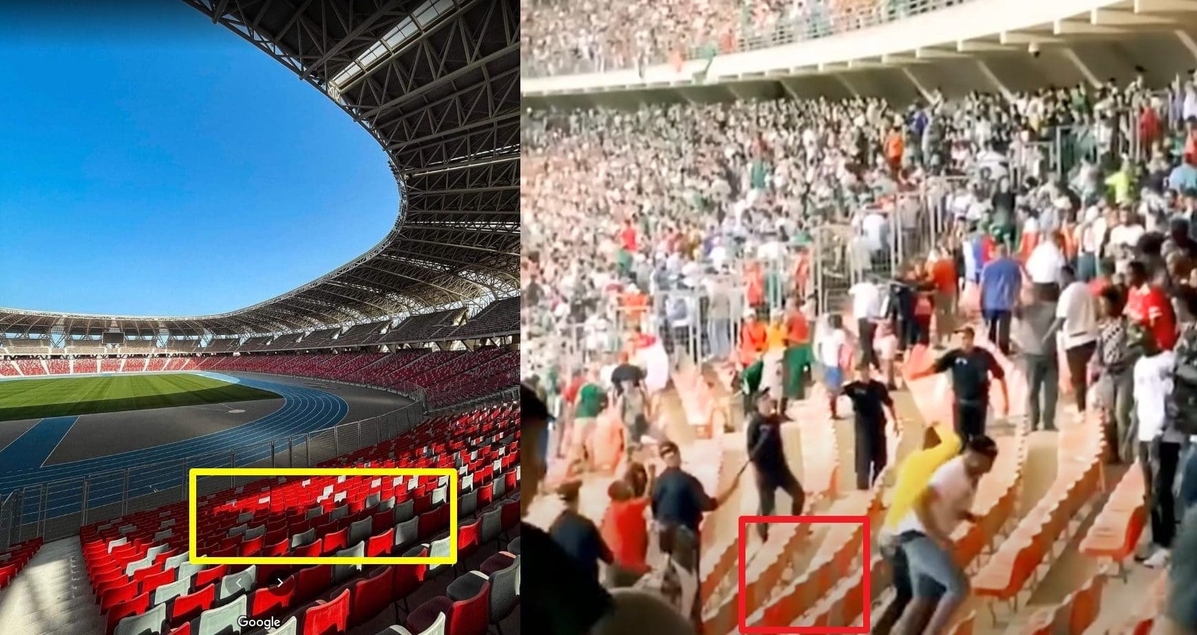 والتي لا تتشابه إطلاقًا في اللون مع مقاعد ملعب نيلسون مانديلا الذي أجريت فيه المباراة الأخيرة بين الجزائر وليبيا.