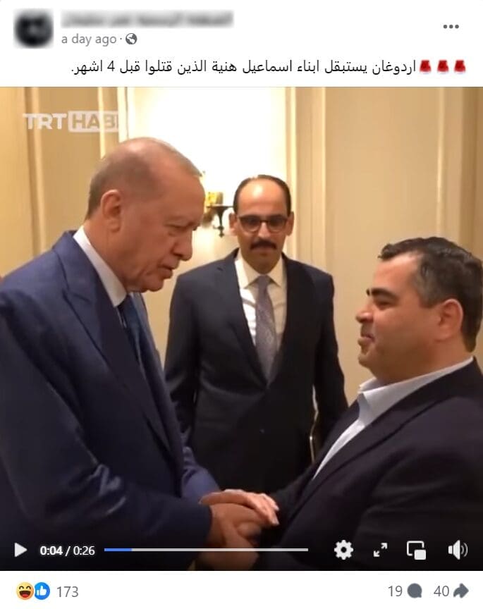 هذا المقطع يظهر استقبال أردوغان أبناء اسماعيل هنية عبد السلام وهمام، ولا يصور أبناء اسماعيل هنية الذين قضوا في غزة في أبريل الماضي