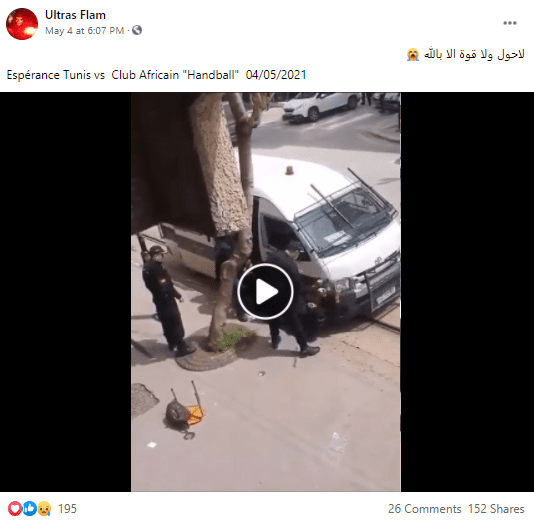 كما أن سيارة الشرطة تعود أيضا إلى قوات الأمن التونسي، ويظهر في احد لقطات المقطع “امن عمومي” على زي احد افراد الشرطة مما يؤكد أن المقطع التقط في تونس،