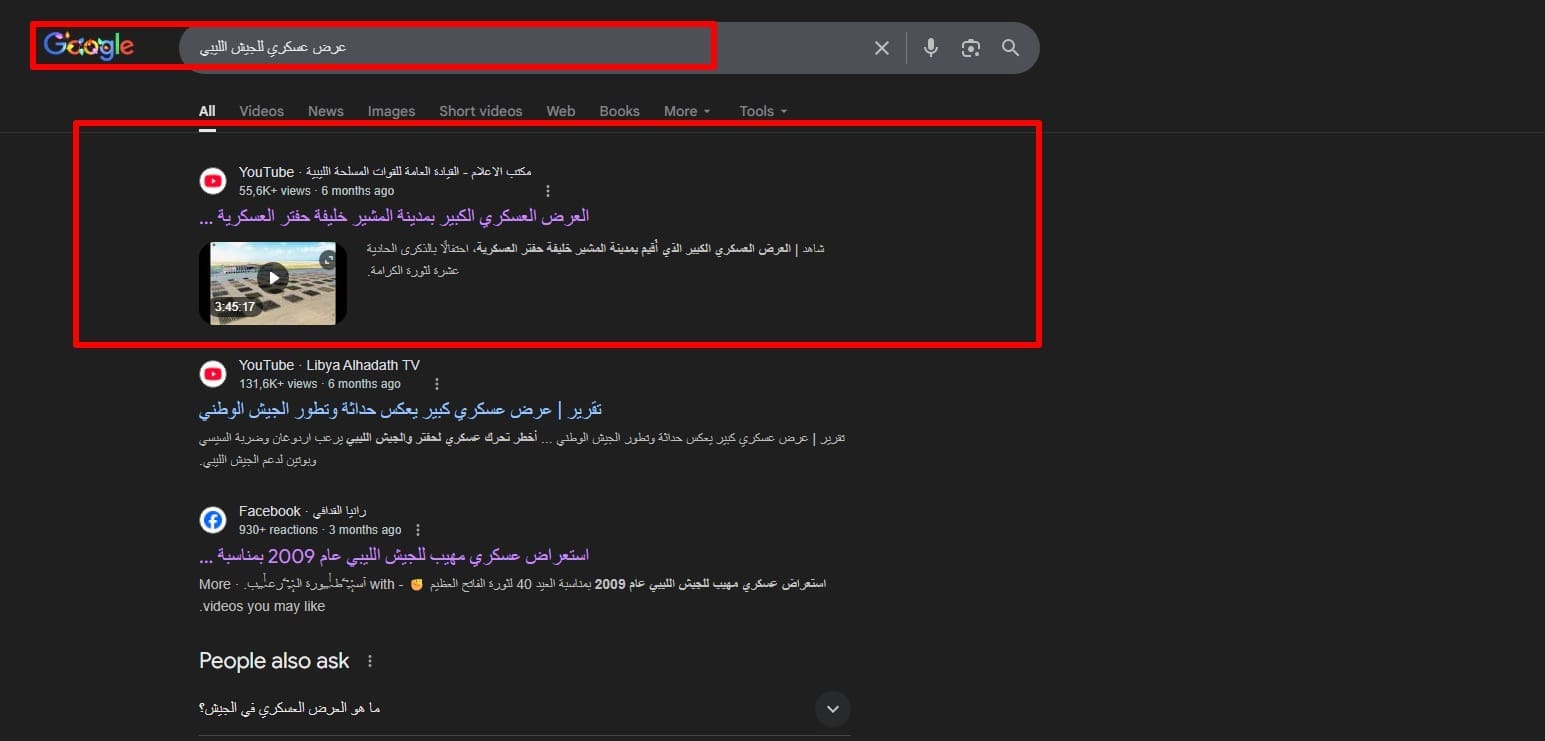 وباستكمال البحث بالكلمات الدلالية، نقع على البث الرسمي للعرض من قناة مكتب الاعلام – القيادة العامة للقوات المسلحة الليبية بتاريخ 1 يونيو 2025، بعنوان “العرض العسكري الكبير بمدينة المشير خليفة حفتر العسكرية احتفالًا بالذكرى 11 لثورة الكرامة”.
