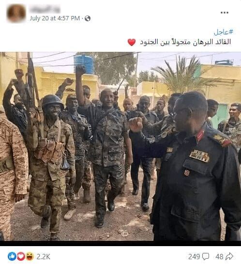 تناقل ناشطون على الفيسبوك صورة يدّعي ناشروها أنها تظهر قائد الجيش السوداني الفريق أول عبد الفتاح البرهان متجولًا بين الجنود في أحد الأحياء في السودان مؤخرًا.