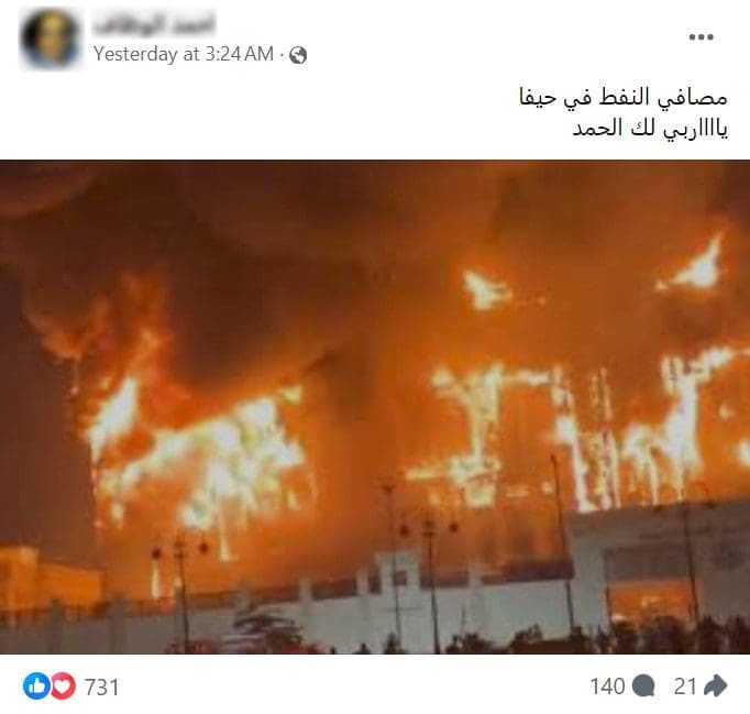 في أعقاب ذلك تداول ناشطون على فيسبوك صورة يدعون أنها تظهر احتراق مصافي نفط في حيفا إثر هذا الاستهداف،