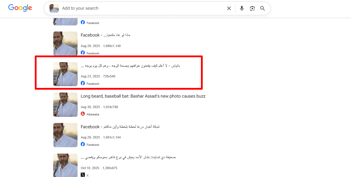 أرشد البحث العكسي عن الصورة في محرك غوغل إلى الصورة ذاتها لكن بحجمها الكامل على حساب في منصة الفيسبوك نُشرت بتاريخ 16 اغسطس 2025،