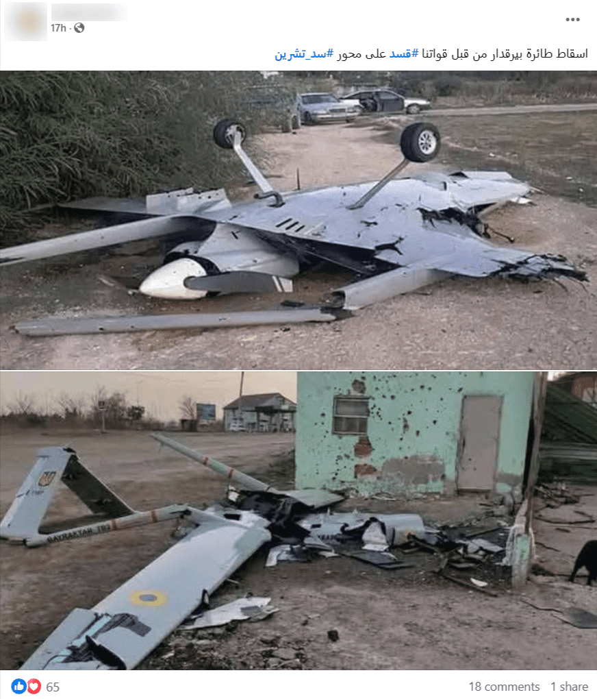 وبالمثل، أرشد البحث العكسي عن الصورة الثانية من الادعاء عبر محرك البحث جوجل إلى الصورة ذاتها، كانت قد نشرتها إحدى الصفحات على فيسبوك بتاريخ 28 أبريل 2022، بعنوان “إسقاط طائرة بدون طيّار من طراز “البيرقدار” في خيرسون، الطائرة الرابعة التي يتم إسقاطها خلال 72 ساعة.”