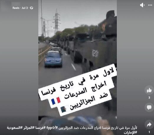إثر ذلك، تناقل ناشطون على منصة فيسبوك مقطعاً يدعى أنه يظهر مدرعات فرنسية خرجت ضد المتظاهرين،