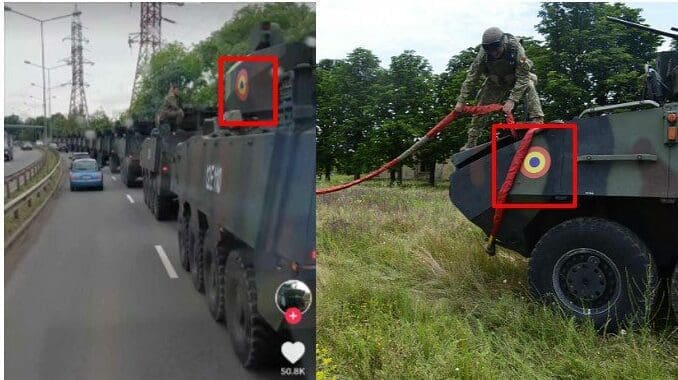 فيما يمكن مطابقة الشعار الظاهر على الآليات الظاهرة في مقطع الادعاء (يسار) والآليات العسكرية في رومانيا (يمين)،