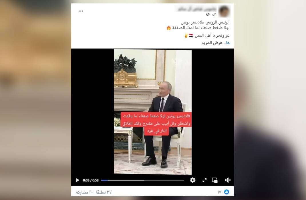 بحسب تقرير نشرته فرانس24 في 16 يناير 2025 –دون تصرف-: «قوبل إعلان اتفاق وقف إطلاق النار بين إسرائيل وحركة حماس في غزة، الأربعاء، بترحيب عربي ودولي. في هذا السياق، دعا قادة العالم إلى التنفيذ الكامل للاتفاق، معتبرين أنه خطوة ضرورية لتحسين الأوضاع الإنسانية في غزة، وتحقيق استقرار دائم في المنطقة»، فيما «أعربت روسيا الخميس عن “أملها” أن يؤدي اتفاق وقف إطلاق النار إلى “استقرار دائم للوضع.”»، إثر ذلك تداول ناشطون على مواقع التواصل الاجتماعي مقطع فيديو يدعون أنه يظهر تصريح للرئيس الروسي فلادمير بوتين تحدث فيه أن الفضل في وقف إطلاق النار في قطاع غزة، يعود للضغط الحوثي على أمريكا وإسرائيل.