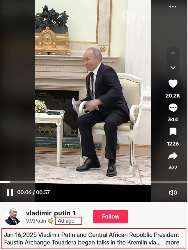 قاد البحث العكسي عن لقطة ثابتة من مقطع الادعاء في محرك البحث جوجل إلى منصة التيكتوك، إذ نشرت إحدى الحسابات على المنصة المقطع ذاته بتاريخ 16 يناير 2025، على أنه يظهر لقاء الرئيس الروسي فلاديمير بوتين بنظيره رئيس جمهورية أفريقيا الوسطى فوستين أرشانج تواديرا في الكرملين بتاريخ 16 يناير 2025.
