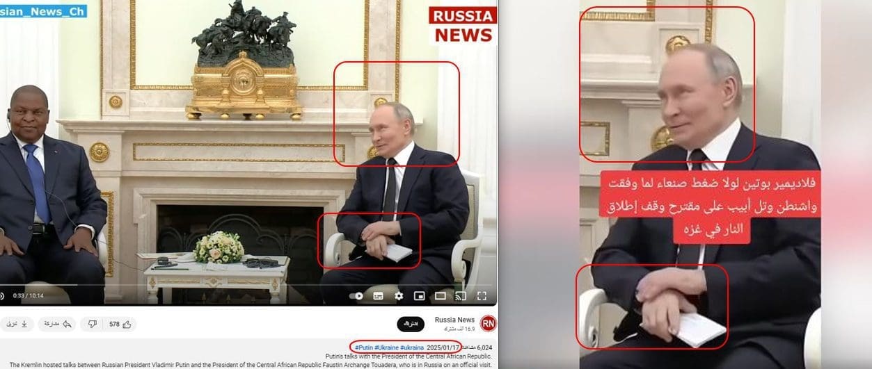 إلى ذلك؛ قاد البحث بالكلمات الدلالية في منصة اليوتيوب إلى العديد من المصادر المحلية الروسية والأفريقية، التي نشرت مشاهد المقطع ذاتها ضمن مقطع بمدة أطول، على أنها توثق لقاء الرئيس الروسي فلايمير بوتين برئيس جمهورية أفريقيا الوسطى فوستين أرشانج تواديرا في الكرملين في يناير 2025.