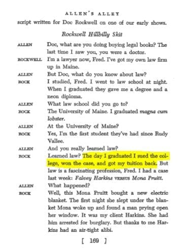 وبحسب ويكيبيديا كتب فريد آلان كتابًا عن حياته المهنية في الراديو والتلفاز باسم (Treadmill to Oblivion) وبالبحث عن الكتاب في Google Books توصلنا إلى الكتاب، وبالتدقيق في الكتاب عثرنا على المقولة في الصفحة رقم 169 بعنوان (Rockwell Hillbilly Skit)