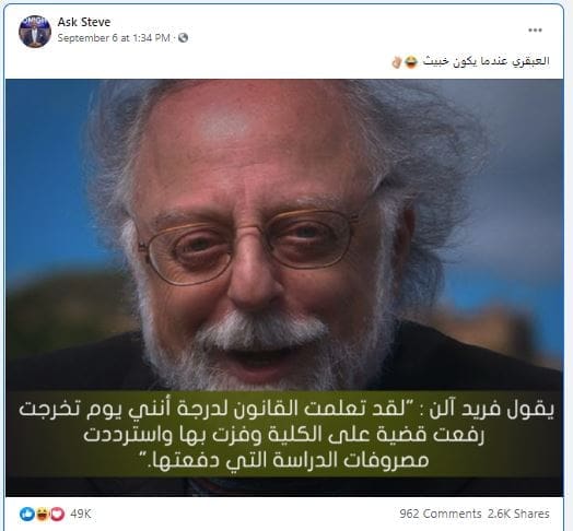 نشرت صفحة Ask Steve على الفيسبوك صورة مكتوبًا عليها وأرفقتها بالنص الوصفي الآتي: (من دون تصرف)