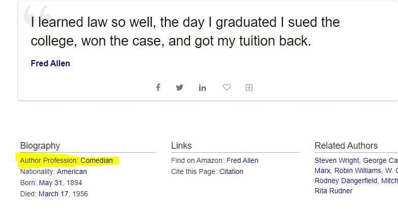 عثرنا على نتائج كثيرة لمواقع اقتباسات للمشاهير والكُتاب قد نشرت المقولة ونسبتها إلى فريد آلان (Fred Allen) الكوميدي