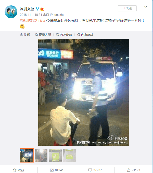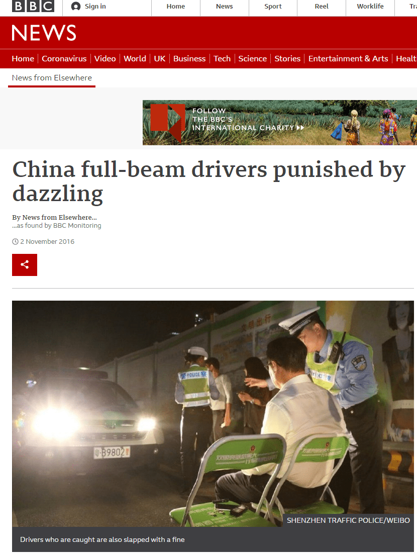 فإن شرطة مدينة شينزن قد شرعت في تطبيق هذه الإجراءات العقابية من أجل ردع السائقين الذين يسلطون ضوء سياراتهم العالي على السائقين الآخرين.