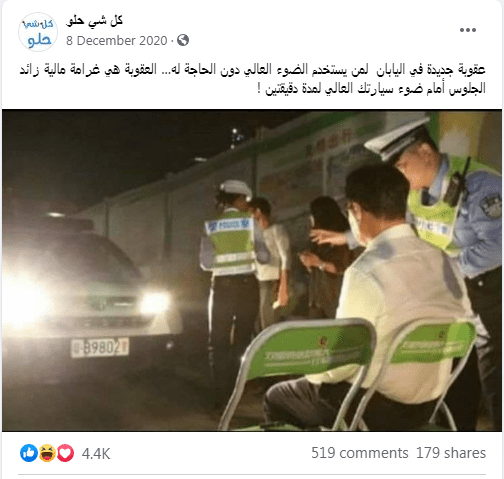 انتشر على موقع التواصل الاجتماعي فيسبوك ادعاء يزعم ناشروه أن السائقين في اليابان الذين يستخدمون ضوء السيارة العالي،