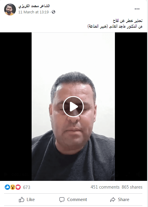 نشر الفيديو صفحة “الشاعر محمد الكريزي” على فيسبوك بتاريخ 11 مارس 2021 وحاز على 673 إعجاب و865 مشاركة حتى لحظة كتابة التقرير بتاريخ 14 مارس 2021.