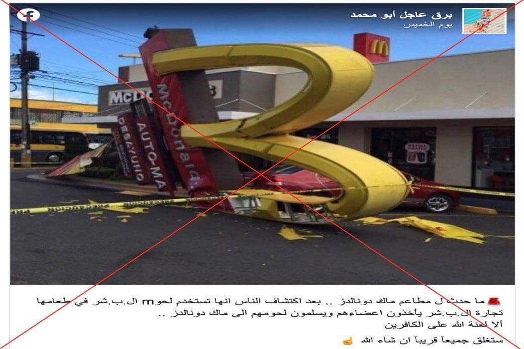 يتناقل رواد منصة فايسبوك صورة تظهر العلامة التجارية لمطاعم ماكدونالدز مكسرة في الأرض، ويزعم ناشروها أنها تظهر تهجم الناس عليها عقب اكتشافهم استخدامها لحوم البشر في الطعام.