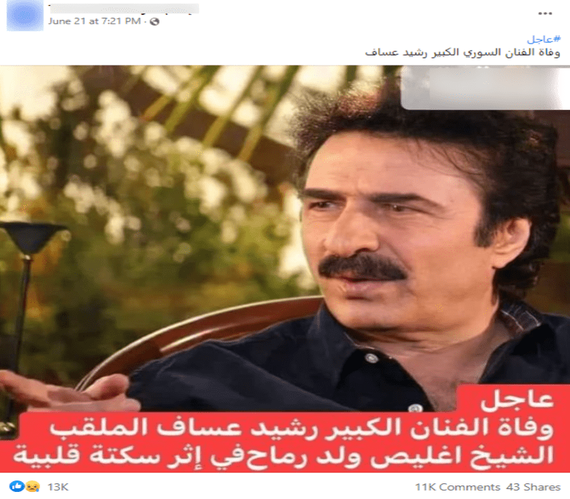 بناءً على ما سبق، قرّرت منصة فتبينوا تصنيف الادعاء على أنّه زائف، إذ نفى الفنان السوري “رشيد عساف” خبر وفاته وأكد أنه بصحة جيدة.